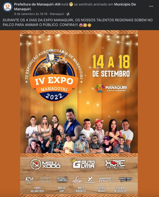 Manaus/AM - O prefeito de Manaquiri, Jair Souto, assinou contrato no valor de R$ 140,4 mil para realização de shows na IV Expo Manaquiri 2022, entre os dias 15 à 18 de setembro. O contrato fechado com a empresa Sintonia Promoções e Eventos Epp foi publicado no Diário Oficial dos Municípios do Amazonas desta segunda-feira (12).