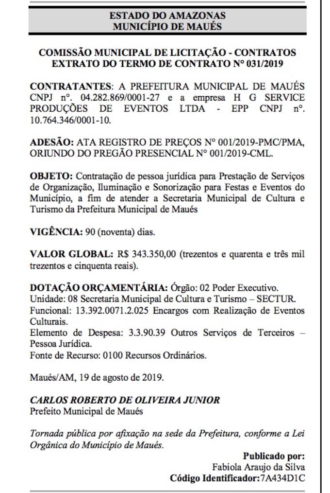 Manaus/AM - O prefeito de Maués, Junior Leite, assinou contrato de R$ 343,3 mil com empresa para organizar festas no município pelo período de 90 dias. O extrato do termo de contrato foi publicado nesta sexta-feira (30) no Diário Oficial dos Municípios do Amazonas.