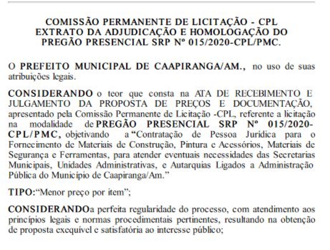 Manaus/AM - O prefeito de Caapiranga/AM, Francisco Andrade Braz - o Tico Braz -, adjudicou empresa para fornecimento de "Materiais de Construção, Pintura e Acessórios, Materiais de Segurança e Ferramenta", objeto do pregão presencial nº 015/2020, conforme publicação no Diário Oficial dos Municípios, edição desta quarta-feira, dia 16 de setembro.