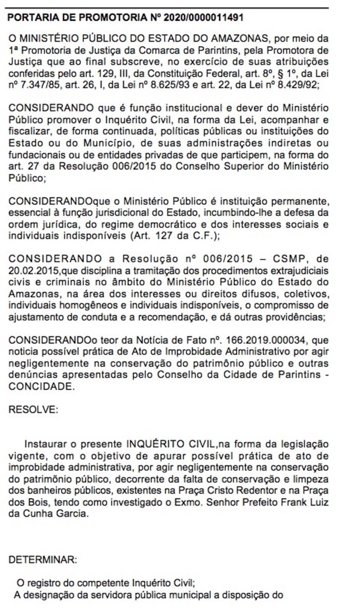 A denúncia que originou as investigações foi apresentada pelo Conselho da Cidade de Parintins (Concidade). A portaria de abertura do inquérito civil foi publicado nesta sexta-feira (21) no Diário Eletrônico do Ministério Público do Amazonas (MP-AM).