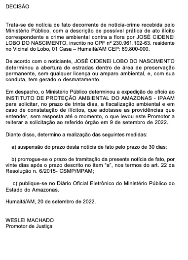 O Instituto de Proteção Ambiental do Amazonas (Ipaam) foi notificado pelo promotor para realizar fiscalização no local, no prazo de 30 dias, mas não houve retorno, por conta disto o prazo de tramitação da denúncia foi prorrogada.