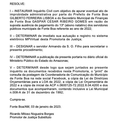 Na portaria de instauração do inquérito ele aponta que o prefeito é suspeito de não cumprir a Lei Orçamentária de 2022 em relação aos gastos com pessoal, referente ao pagamento do 13º salário, também chamado de abono natalino pelos servidores. Para o procurador o descumprimento pode ter ocorrido por conta de despesas não autorizadas com recursos públicos ao longo do ano.