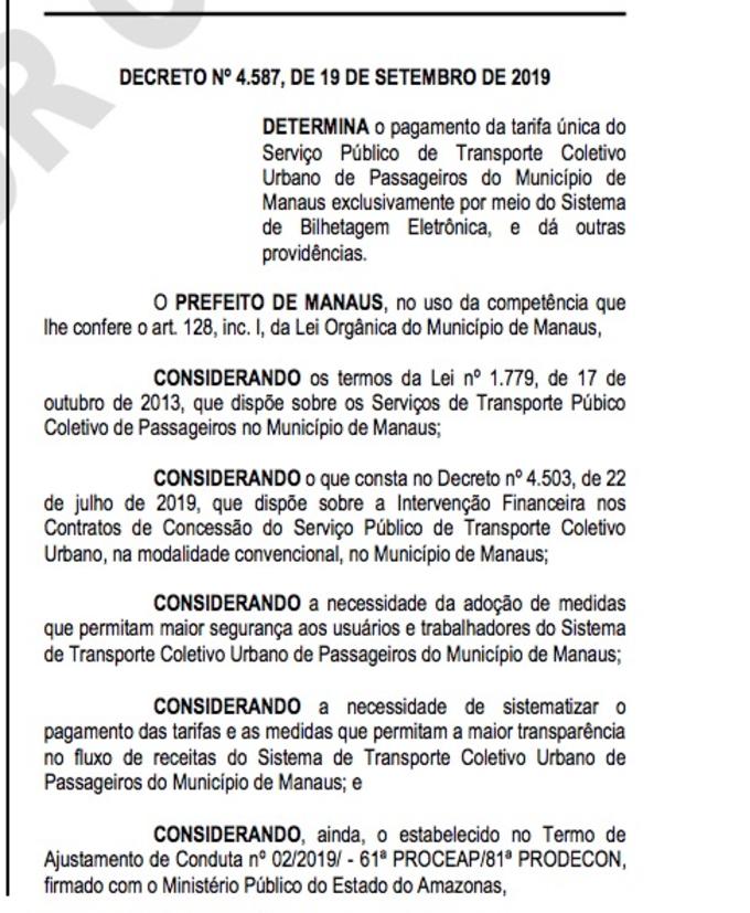 O decreto também está sendo adotado devido a assinatura do Termo de Ajustamento de Conduta (TAC) entre a Prefeitura com o Ministério Público do Estado do Amazonas (MP-AM), que apontou dez soluções para melhorias e segurança no transporte coletivo de Manaus, entre elas o fim do dinheiro nos coletivos.