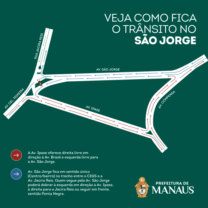 Finalizados os trabalhos de retirada do canteiro central, a avenida São Jorge, no trecho entre o Cigs e a avenida Jacira Reis, ficará mão única, no sentido Centro/bairro. O fluxo da avenida Coronel Teixeira, no sentido bairro/Centro, será desviado à direita para a avenida Ipase e para a avenida Compensa, que terão fluxo em mão única em direção à avenida São Jorge. Quem segue pela avenida São Jorge, sentido Centro/bairro, poderá dobrar à esquerda em direção à avenida Ipase ou seguir em frente, sentido Ponta Negra.