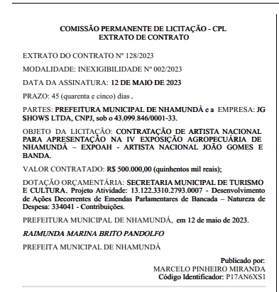 Ainda de acordo com o contrato, os recursos para pagamento do cachê de João Gomes são oriundos de emendas parlamentares que foram destinadas para a Secretaria Municipal de Turismo e Cultura.