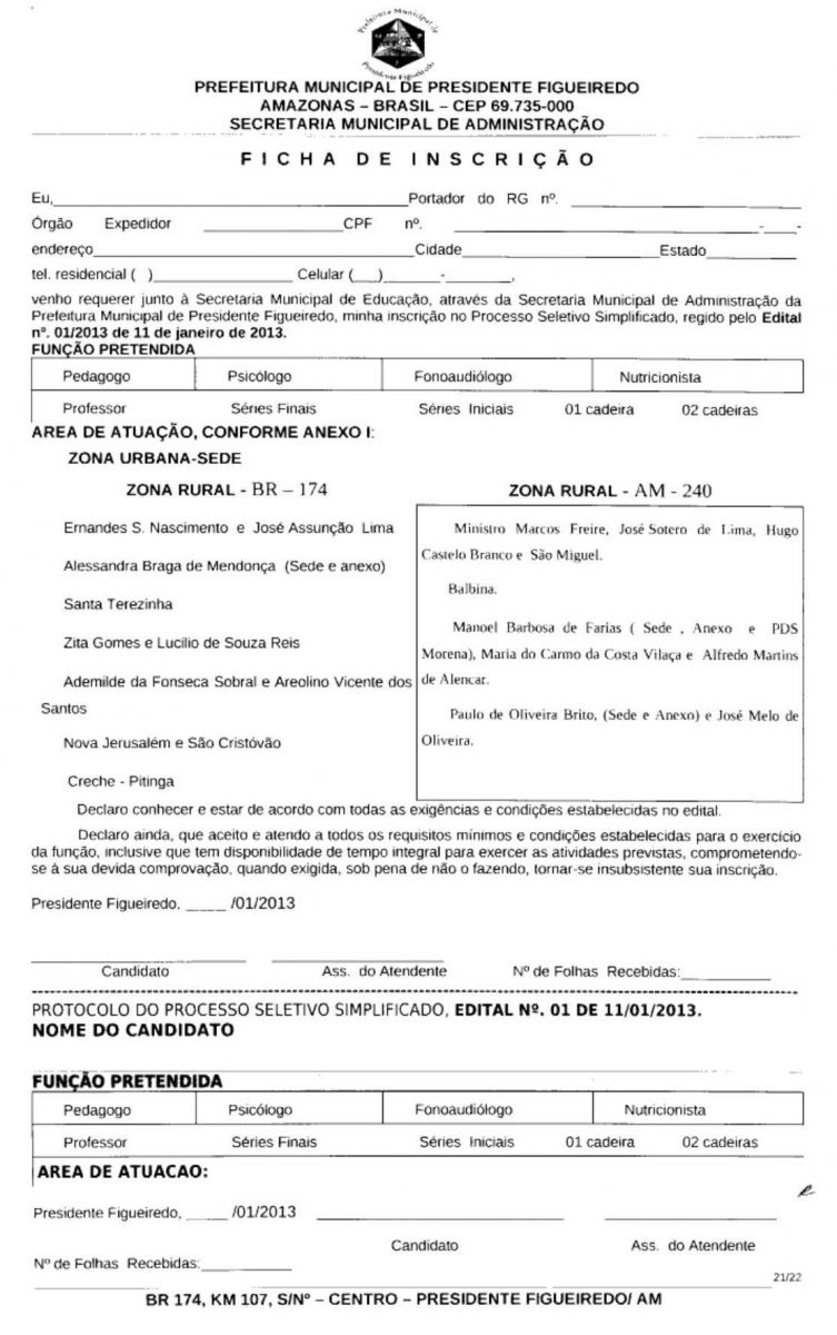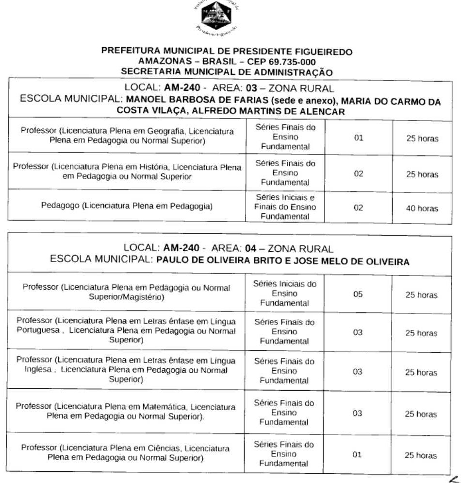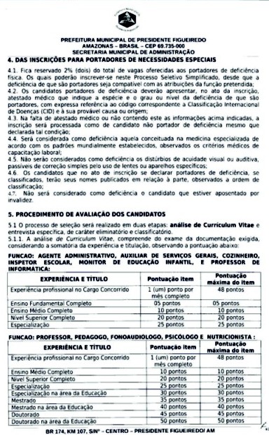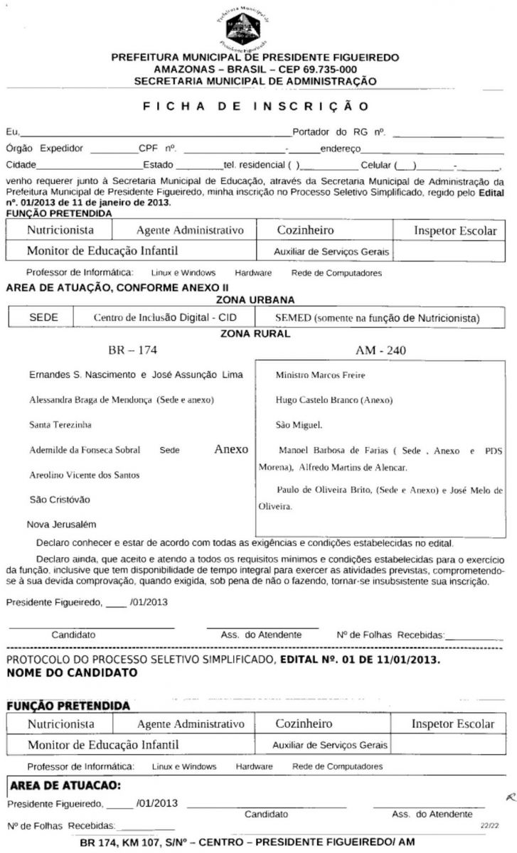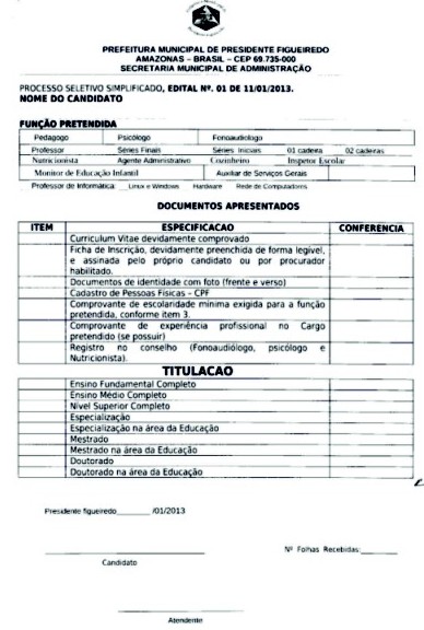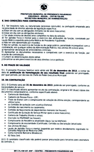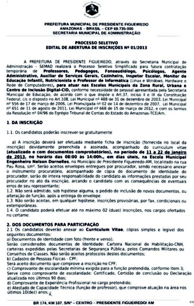 O municipio de Presidente Figueiredo, a 110 quilômetros de Manaus, abriu inscrições para processo seletivo que visa contratar 500 funcionários para diversas áreas da administração municipal. Os salários variam de R$ 900 a R$ 5,2 mil.