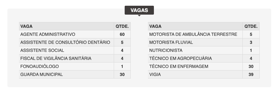 O edital que oferta 186 vagas é destinado para diversas vagas na Prefeitura de Novo Aripuanã, como agente administrativo, guarda municipal, técnico em enfermagem, vigia e entre outra áreas. As inscrições também iniciam no dia 2 de dezembro até 3 de janeiro, através do site do Instituto Merkabah.