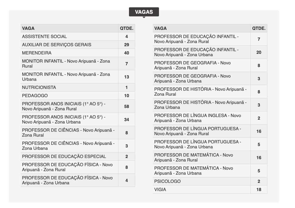 O edital do concurso público para a Semed de Novo Aripuanã prevê o preenchimento de 334 vagas, para diversas funções, com destaque para professor, merendeira e auxiliar de serviços gerais. As inscrições iniciam no próximo dia 2 de dezembro e seguem abertas até o dia 3 de janeiro de 2023, devendo ser realizadas através do site do Instituto Merkabah, responsável pela organização do concurso.
