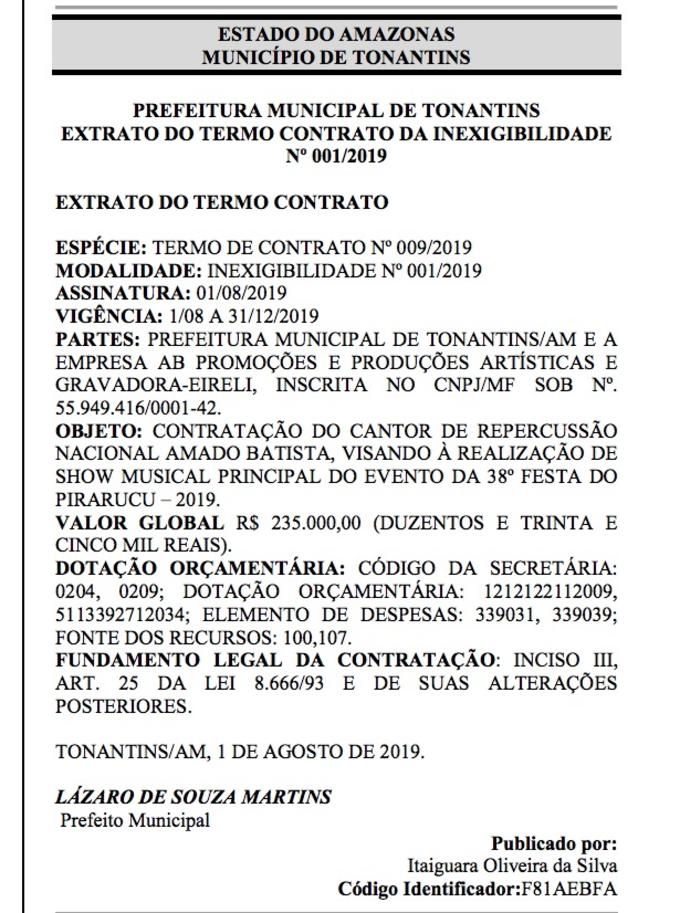 Manaus/AM - A Prefeitura de Tonantins vai gastar R$ 235 mil com a contratação do cantor Amado Batista, que se apresentará na 38ª Festa do Pirarucu. O Extrato do Termo de Contrato da Inexigibilidade foi publicado nesta quarta-feira (11), na edição do Diário Oficial dos Municípios do Amazonas.