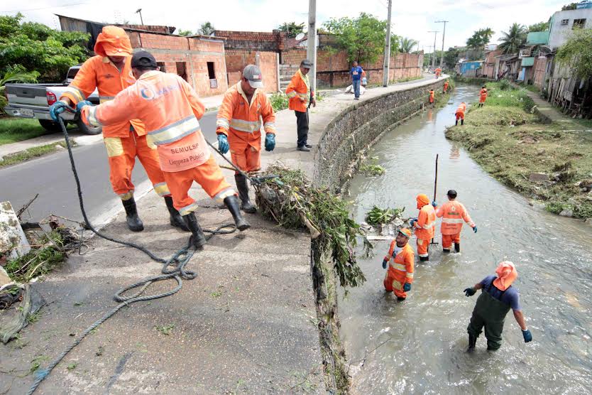 Além da coleta, a Semulsp atua diariamente canalizando igarapés e construindo rip-rap principalmente nas orlas dos bairros de São Raimundo e de Educandos.