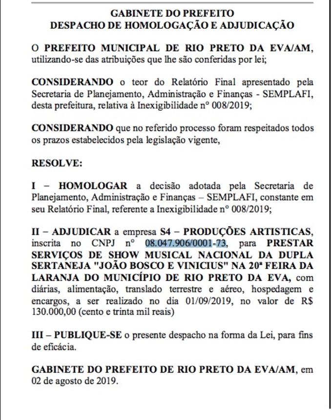 A publicação do despacho homologou a decisão da Secretaria de Planejamento, Administração e Finanças da Prefeitura de Rio Preto da Eva, referente a inexigibilidade de licitação nº 008/2019 e adjudicou a empresa contratada que representa a dupla, a S4-Produções Artísticas.