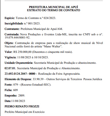 Manaus/AM - A Prefeitura de Apuí, no interior do Amazonas, fechou a contratação do cantor de forró Mano Walter pelo valor de R$ 250 mil. O contrato foi publicado no Diário Oficial dos Municípios desta quarta-feira (16).