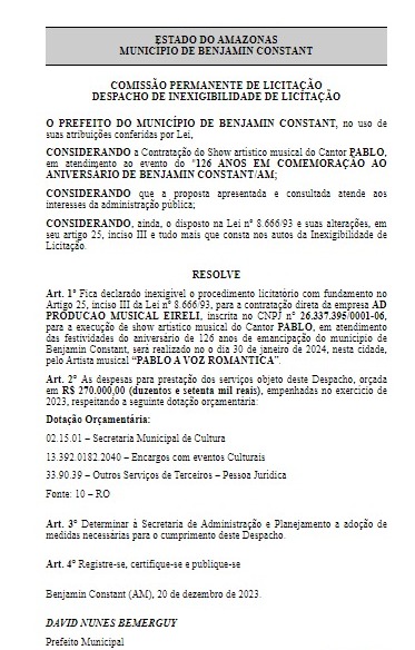 De acordo com edição do Diário Oficial dos Municípios (DOM), o show acontece em comemoração do aniversário de 126 anos da cidade. A empresa contratada é a A D Produção Musical EIRELI, inscrita sob o CNPJ n°26.337.395/0001-06.