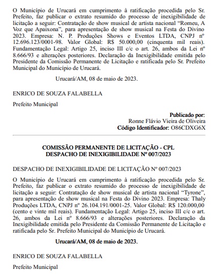 O contrato foi firmado com a empresa Thaly Produções Ltda, assinado na segunda-feira (8), que tem Tayrone como sócio, de acordo com consulta ao CNPJ informado pela Prefeitura de Urucará.