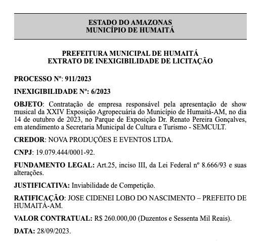 O contrato foi firmado por meio de inexigibilidade de licitação, conforme extrato publicado no Diário Oficial dos Municípios do Amazonas nesta sexta-feira (29).