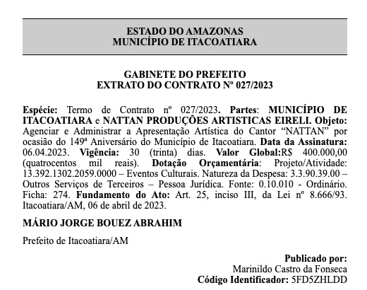 Os contratos com os dois artistas foram publicados nesta sexta-feira (14) no Diário Oficial dos Municípios. Nattanzinho vai receber R$ 400 mil da prefeitura e, Vítor Fernandes, R$ 250 mil.