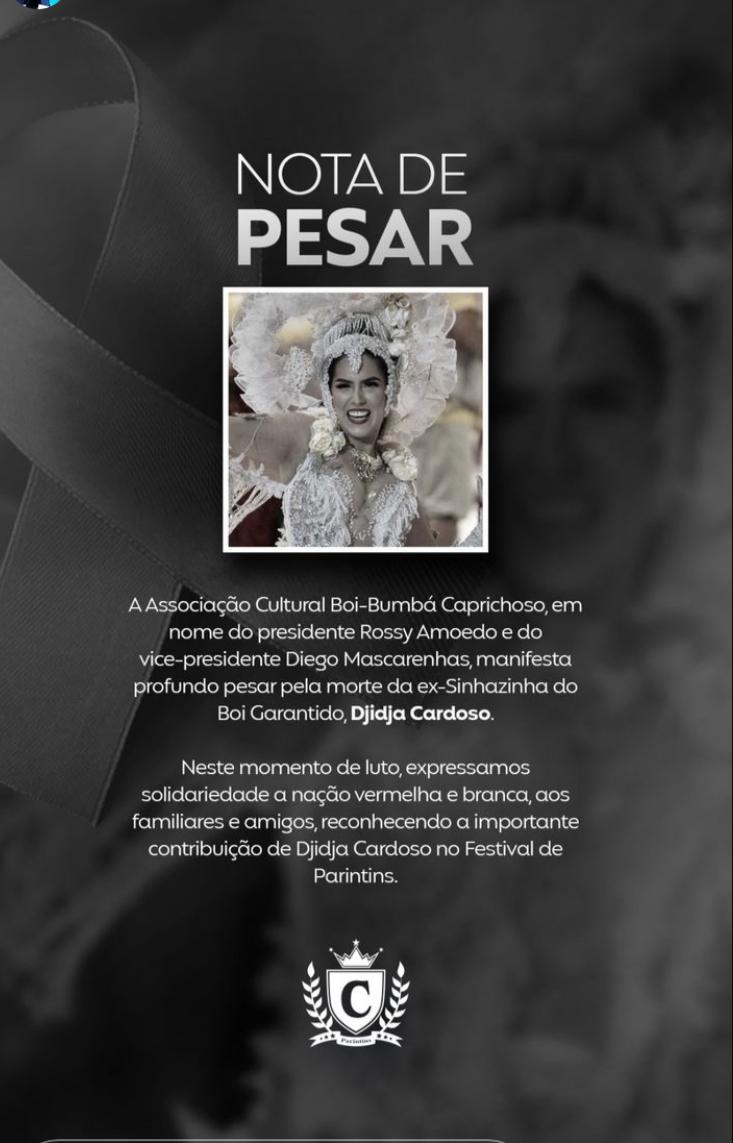 Manaus/AM - A Associação Cultural do Boi-Bumbá Caprichoso lamentou a morte da ex-sinhazinha do Boi Garantido, Djidja Cardoso, de 32 anos, que ocorreu nesta terça-feira (28).