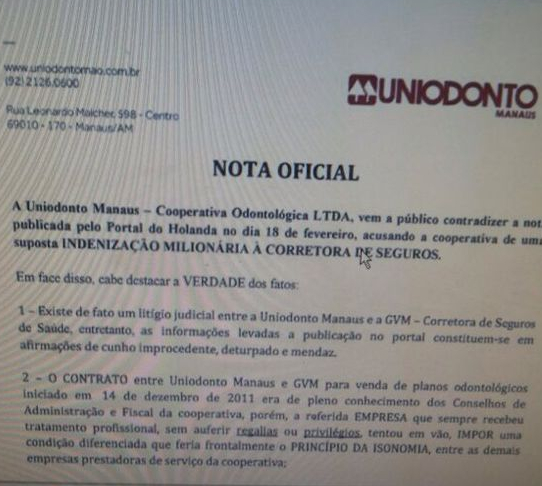 Manaus/AM – A Uniodonto emitiu nota sobre material publicado nesta terça-feira, 18, pelo Portal do Holanda, onde a administração da cooperativa emite juízo sobre eventuais privilégios e condições especiais que sua contratada, GVM Corretora de Planos de Saúde e Odontológicos, estaria querendo impor à Uniodonto.