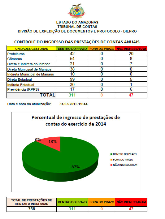 Segundo informação da Assessoria de Comunicação do Tribunal de Contas do Estado (TCE), até 19h44 de terça-feira - último dia do prazo para entrega das prestações de contas - 311 gestores públicos, correspondentes a 87% dos 358 previstos, entregaram a prestação de contas, referente ao ano de 2014. O protocolo ficará aberto até a meia-noite desta quarta-feira, 01.