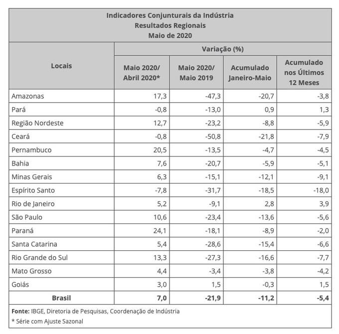 Para o IBGE, as taxas positivas em 12 dos 15 locais pesquisados dentro do crescimento de 7,0% da atividade industrial nacional, na série livre de influências sazonais, verificado na passagem de abril para maio de 2020, refletem, principalmente, o retorno à produção, mesmo que parcialmente, de unidades produtivas, após as interrupções geradas por efeito da pandemia de covid-19.