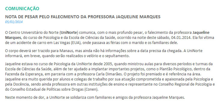 As páginas da Faculdade Martha Falcão e Uninorte publicaram neste domingo (05), nota de pesar pelo falecimento da professora Jaqueline Marques, do Curso de Psicologia.