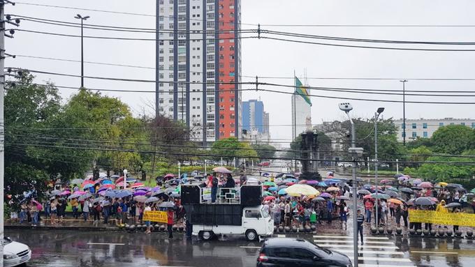 Manaus/AM - Nem a chuva impediu a passeata organizada pelos professores na manhã dessa segunda-feira (20). Com guarda-chuvas eles avançam pela ruas do Centro da cidade.
