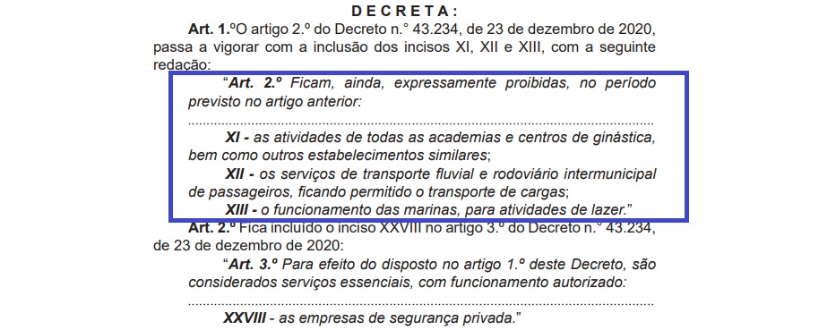 O decreto entrou em vigor no dia 12 e vale até 17 de janeiro, obedecendo decisão liminar do dia 2 de janeiro, a qual estabeleceu o fechamento dos serviços não essenciais por 15 dias.