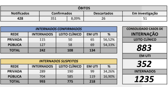 Quanto aos 993 pacientes internados considerados suspeitos e que aguardam a confirmação do diagnóstico. Desses, 775 estão em leitos clínicos (190 na rede privada e 585 na rede pública) e 218 estão em UTI (99 na rede privada e 119 na rede pública).