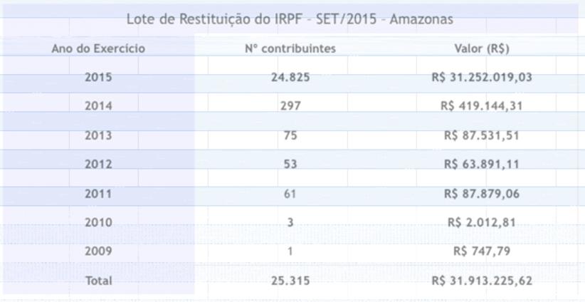 O lote de restituição do Imposto sobre a Renda da Pessoa Física ainda contempla restituições de 2014, 2013, 2012, 2011, 2010 e 2009. Os montantes de restituição para cada exercício referentes ao Amazonas podem ser acompanhados na tabela abaixo: