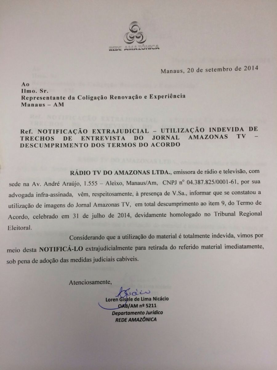 MANAUS - Com o objetivo de resguardar a imagem da emissora e de sua equipe, a Rede Amazônica, responsável pela retransmissão da Rede Globo em nossa região, notificou a coligação "Renovação e Experiência" que tem como candidato ao governo o senador Eduardo Braga, por uso indevido de imagens de uma de suas atrações, descumprindo um dos termos assinado e homologado no Tribunal Regional Eleitoral.