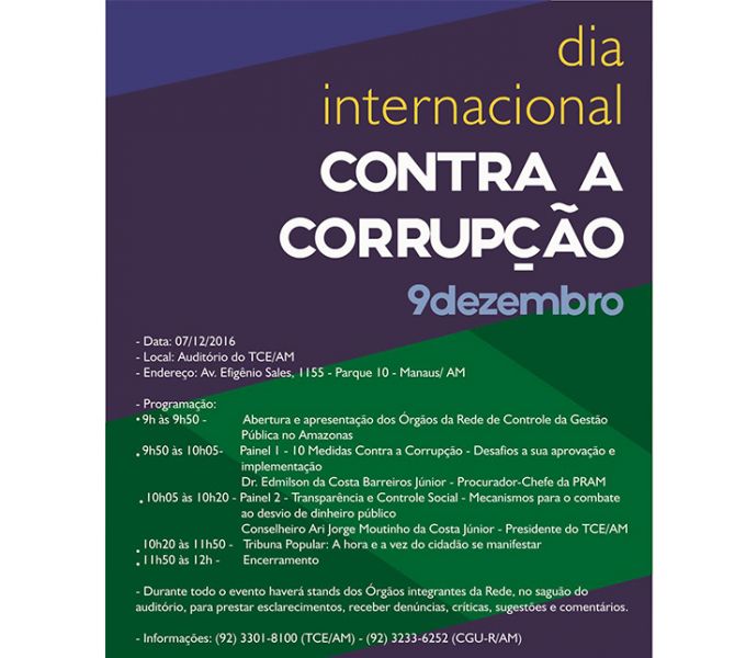 Manaus/Am - Em alusão ao Dia Internacional Contra a Corrupção, celebrado na próxima sexta-feira (9/12), o Tribunal de Contas do Amazonas (TCE-AM) sedia, nesta quarta (7), às 9h, no auditório, um grande encontro dos órgãos que integram a Rede de Controle da Gestão Pública no Amazonas com os os membros dos conselhos municipais e estaduais (saúde, educação e etc.), representantes de associações e sindicatos e cidadãos interessados na correta aplicação do dinheiro público.