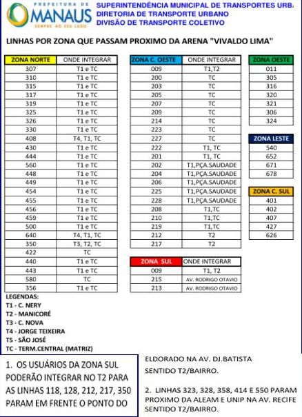 Trinta fiscais de transporte da SMTU acompanharão as atividades da frota nos itinerários planejados e orientarão os motoristas de ônibus e usuários do transporte urbano. Os principais pontos de embarque e desembarque localizados nas proximidades da Arena estão na avenida Djalma Batista, nos sentidos Bairro/ Centro e Centro/ Bairro, nas proximidades da saída do conjunto Eldorado e em frente a Universidade do Estado do Amazonas – UEA. Na avenida Mário Ypiranga Monteiro (antiga Recife), em ambos os sentidos, próximo a Assembleia Legislativa do Amazonas – Aleam, a Universidade Paulista - UNIP e ao Supermercado Carrefour de Flores, além da avenida Darcy Vargas, em ambos os sentidos, próximo ao Amazonas Shopping.