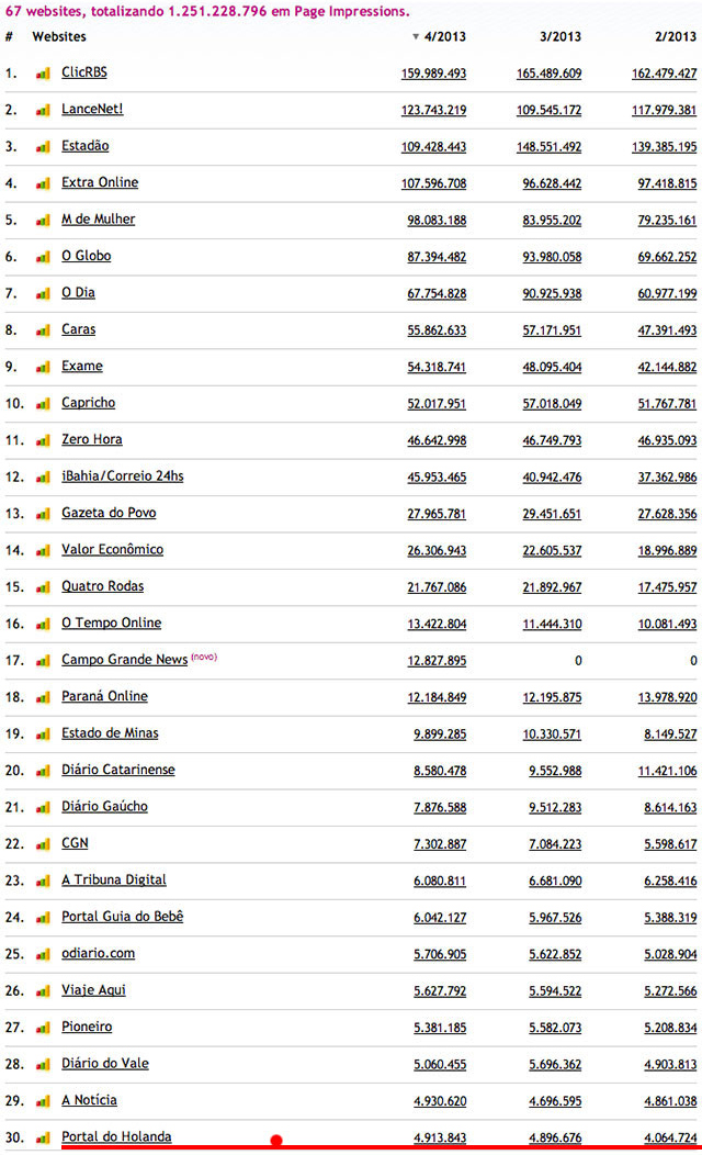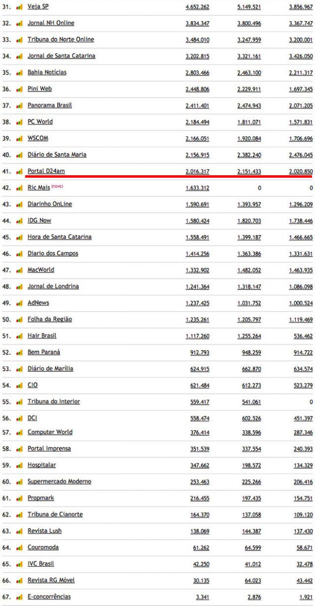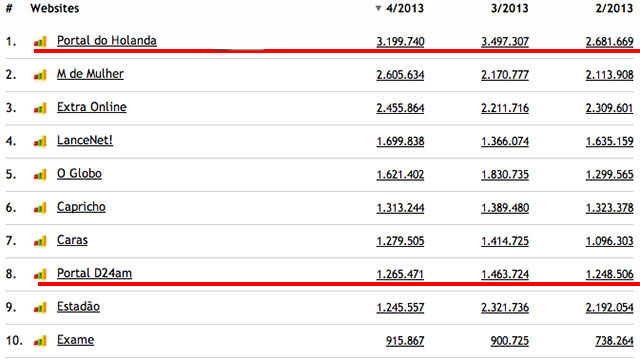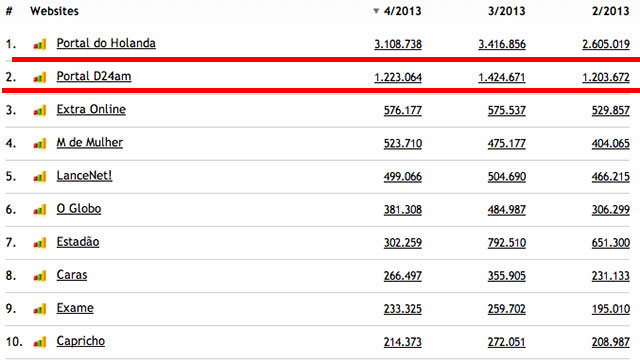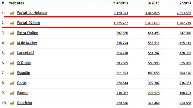 O Portal do Holanda fechou o mês de abril com 502.982 acessos únicos, o que significa que igual número de computadores em todo o Brasil acessaram o site, que continua em primeiro lugar em Manaus, no Amazonas, na Região Norte e é o 30o portal nacional, com 4,9 milhões de visualizaçoes de páginas, 200 mil a mais do que o registrado em março, segundo dados do IVC - Instituto de Verificação de Circulação. O Portal do Holand a tem o dobro de visualizaçoes do D24, o Portal de Noticia do Grupo Diário do Amazonas ( Veja tabela) e mais visibilidade do que o jornal aCritica, que segundo dados publicados no site do UoL possui apenas tres milhões de visualizações de páginas.