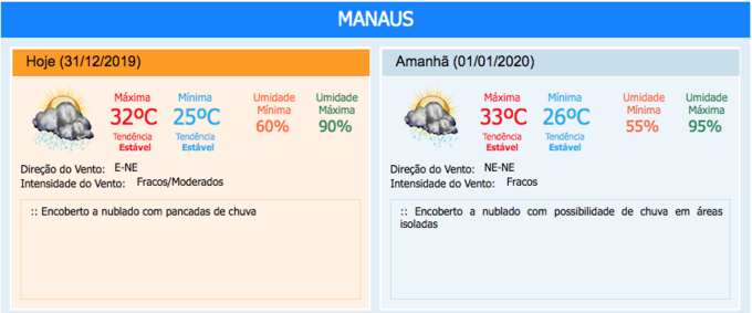 Conforme o Instituto, Manaus está entre as capitais mais quentes na virada do ano, com previsão de temperaturas entre 33 a 34°C e dias nublado com chances de chuva em áreas isoladas, até a próxima sexta-feira (03), isso porque a partir do mesmo dia, as temperaturas devem começar a cair em todo o Brasil.