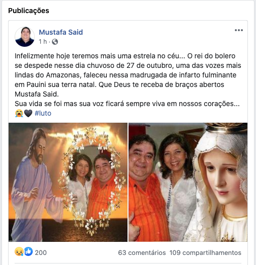 Manaus/AM - O cantor de bolero Mustafa Said, 42, morreu nesta terça-feira (27), após sofrer um infarto enquanto dormia em casa no município de Pauini. Apesar do óbito confirmado, um suposto print, datado de 27 de setembro, onde o artista disse estar vivo após boatos de sua morte, passou a circular na internet, o que confundiu alguns fãs quanto à veracidade da informação.