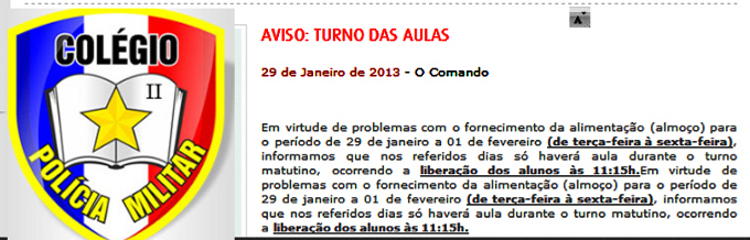 De acordo com aviso que está na página oficial do colégio no endereço http://www.cmpm2.com.br, em virtude de problemas com fornecimento de alimentação no período de 29 de janeiro a 1 de fevereiro, só haverá aulas pelo período matutino.