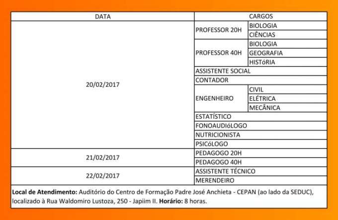 O Governo do Amazonas, por meio da Secretaria de Estado de Educação e Qualidade do Ensino (SEDUC), convoca os candidatos aprovados no concurso público de 2014 para tomar posse e lotação em seus respectivos cargos, nos dias especificados conforme na tabela abaixo.