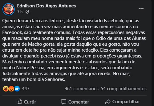 Manaus/AM - Após uma série de denúncias sobre comportamento profissional nas redes sociais, fez com que a Seduc (Secretaria de Estado de Educação e Desporto), pedisse o afastamento do professor Ednilson dos Santos Antunes, que leciona em escolas da Zona Norte de Manaus.
