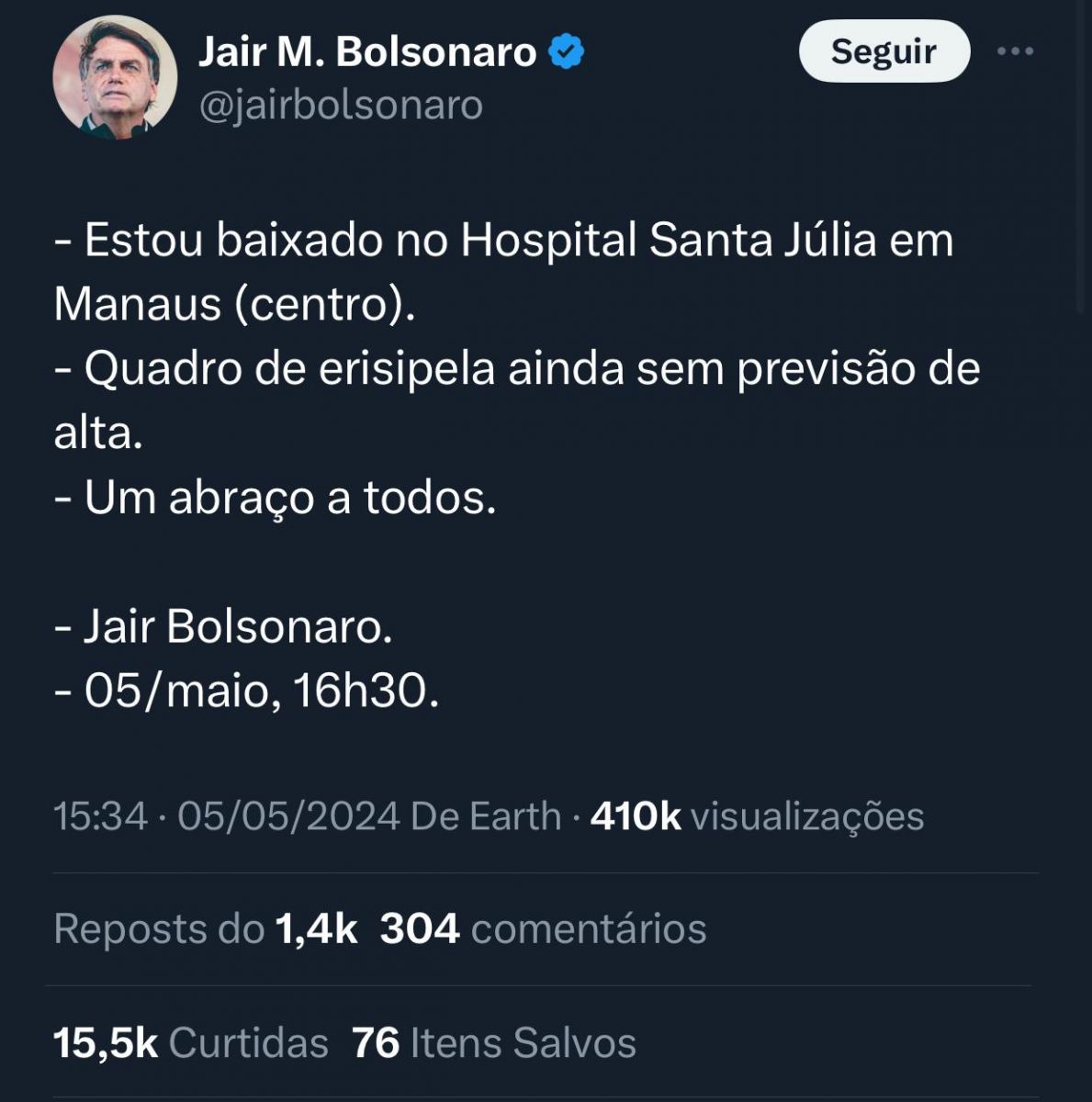 "Estou baixado no Hospital Santa Júlia em Manaus (centro). Quadro de erisipela ainda sem previsão de alta. - Um abraço a todos", escreveu Bolsonaro no Twitter.