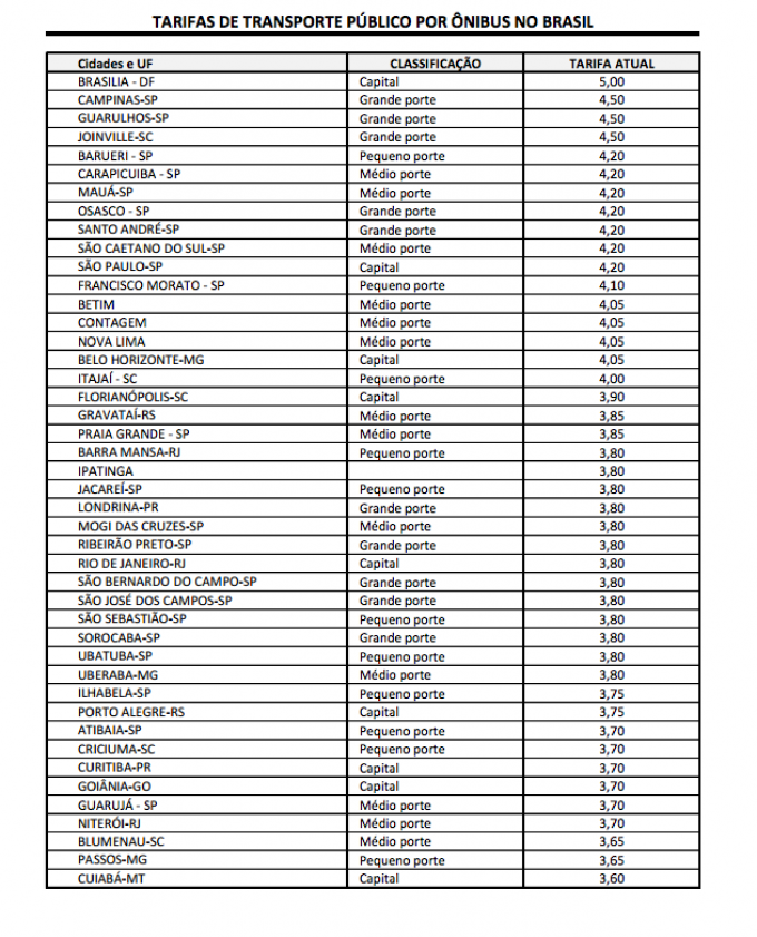 De acordo com cálculos preliminares, o valor da tarifa ficaria em torno de R$ 6 sem os subsídios pagos pelo Governo. Atualmente, a passagem de ônibus mais cara é cobrada em Brasília (DF), veja a tabela: