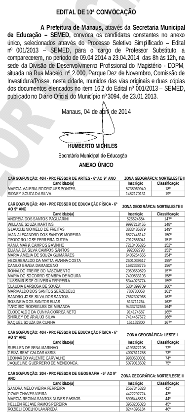 O Diário Oficial do Município (DOM) desta terça-feira, 08, divulgou a lista com o nome de 218 selecionados por meio do Processo Seletivo Simplificado (PSS) de 2013 da Secretaria Municipal de Educação (Semed). As vagas são para professor.