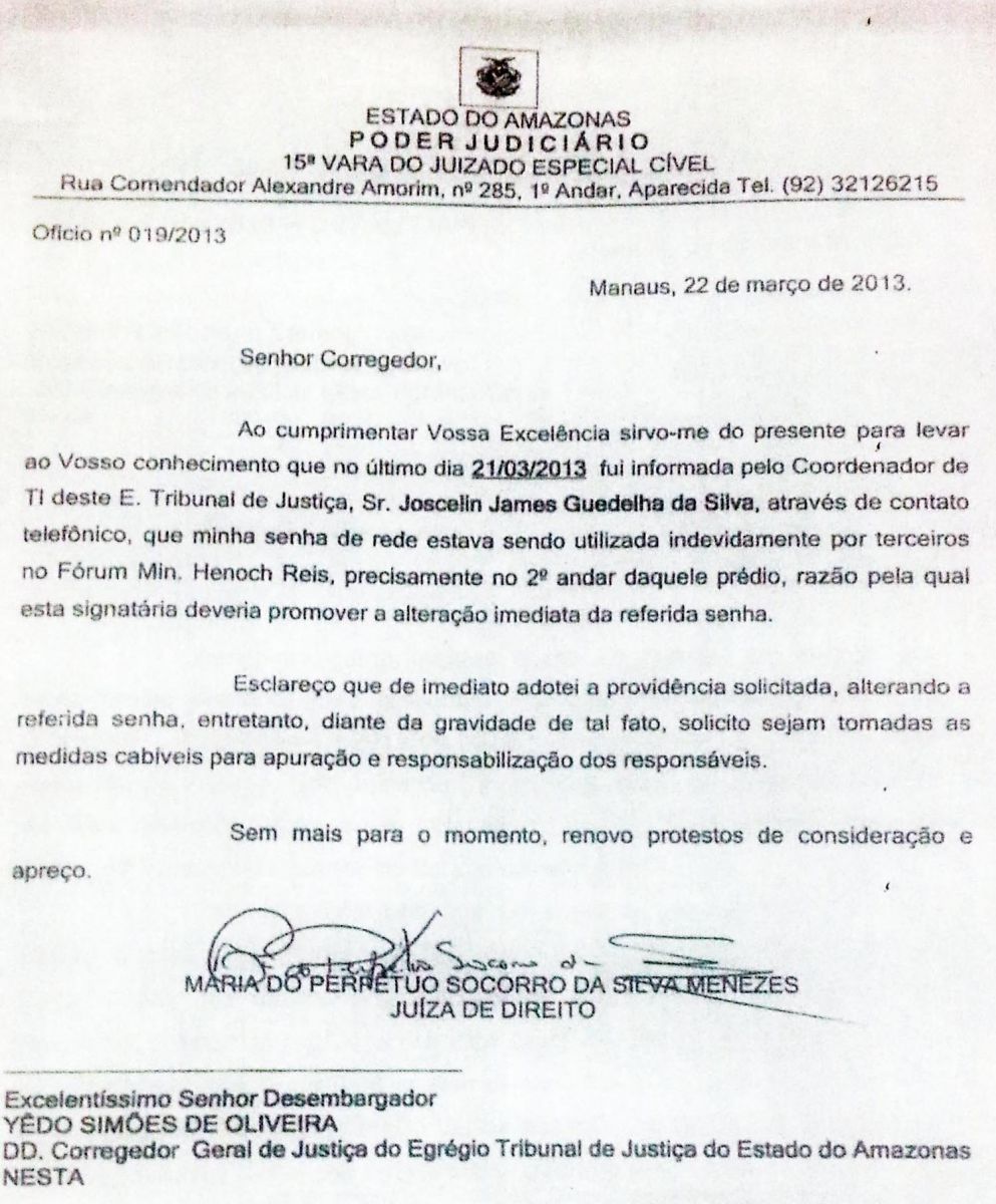 A senha que a juiza Maria do Perpétuo Socorro da Silva Menezes utiliza para ter acesso a rede de dados restrita do Tribunal de Justiça do Amazonas era utilizada por pelo menos 200 pessoas. A descoberta foi feita pela própria magistrada, que comunicou o fato em 22 de março ao corregedor do Tribunal, Yedo Simões. Com a senha, era possível movimentar processos, acessar dados sigilosos e vender facilidades a interessados na tramitação de ações no Tribunal.