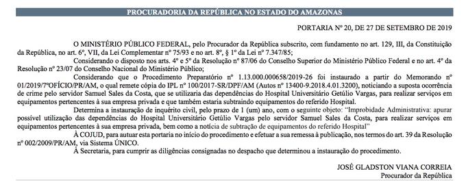 Manaus/AM - O servidor Samuel Sales da Costa está sendo alvo de investigação do Ministério Público Federal no Amazonas (MPF) por supostamente realizar serviços dentro do Hospital Universitário Getulio Vargas (HUGV) em equipamentos que pertencem à sua empresa e também pelo furto de equipamentos do hospital. Um inquérito foi aberto determinado pelo procurador José Gladston Correia.