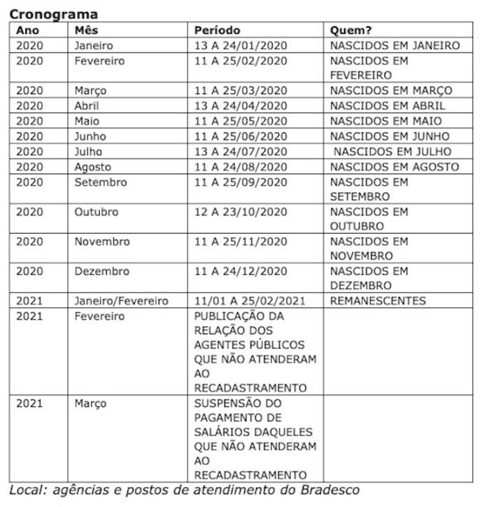 “O recadastramento obrigatório abrange todo esse público e segue um calendário que leva em conta o mês de aniversário do servidor. Quem nasceu em janeiro, por exemplo, terá que procurar um posto ou uma agência do Bradesco entre os dias 13 e 25 de janeiro e apresentar uma série de documentos. Se o servidor tiver um dependente, ele precisa levar os documentos comprobatórios, conforme exigido no Decreto nº 41.350. São exigidos documentos específicos, também, de quem não mora no estado, para procuradores e representantes legais”, disse a secretária.