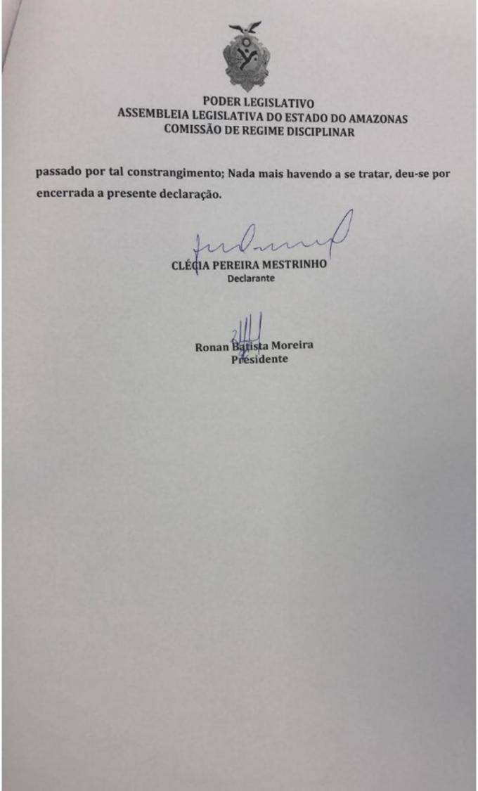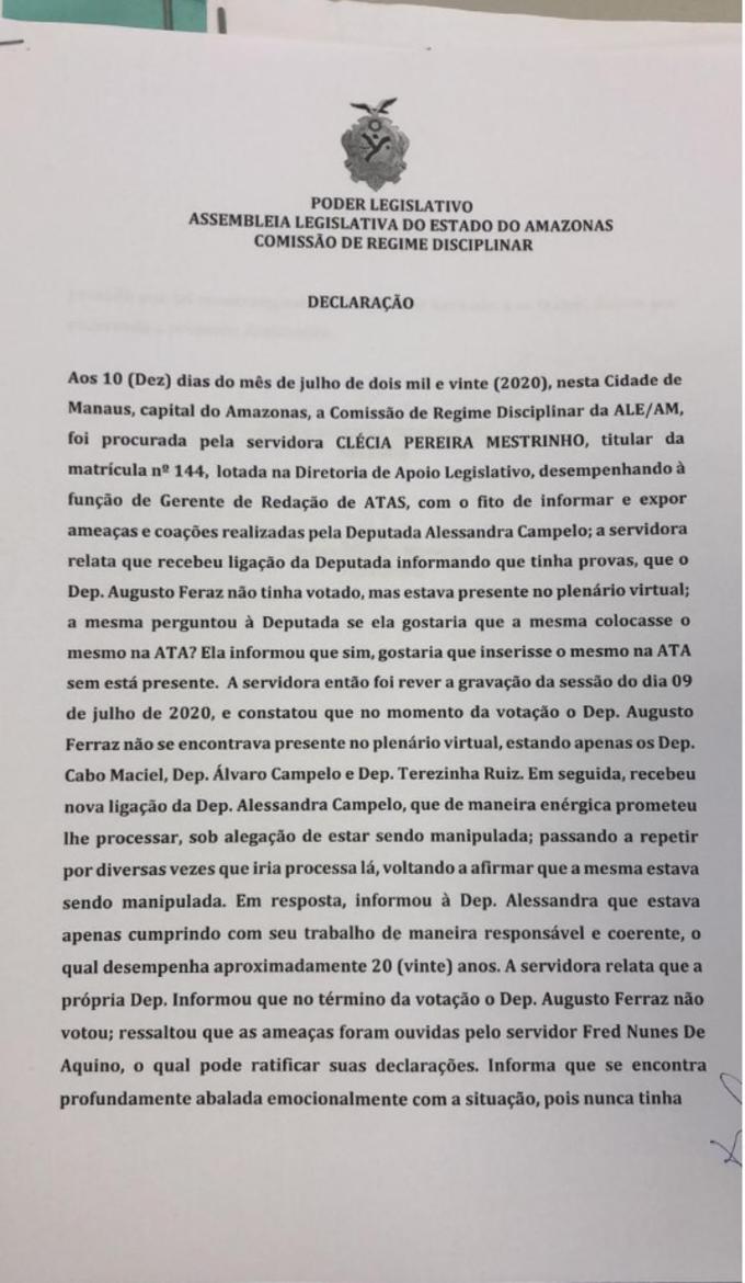 Manaus/AM - A servidora Clécia Pereira Mestrinho denunciou à Comissão de Regime Disciplinar da Assembleia Legislativa do Amazonas (Aleam) ameaças e coações feitas pela deputada Alessandra Campêlo.