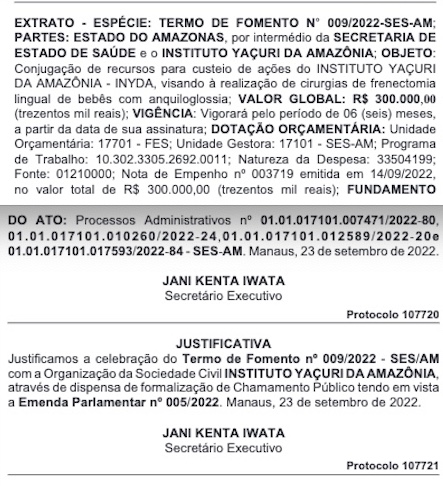 O extrato do Termo de Fomento foi publicado no Diário Oficial do Estado, assinado pelo secretário executivo da SES-AM, Jani Kenta Iwata.