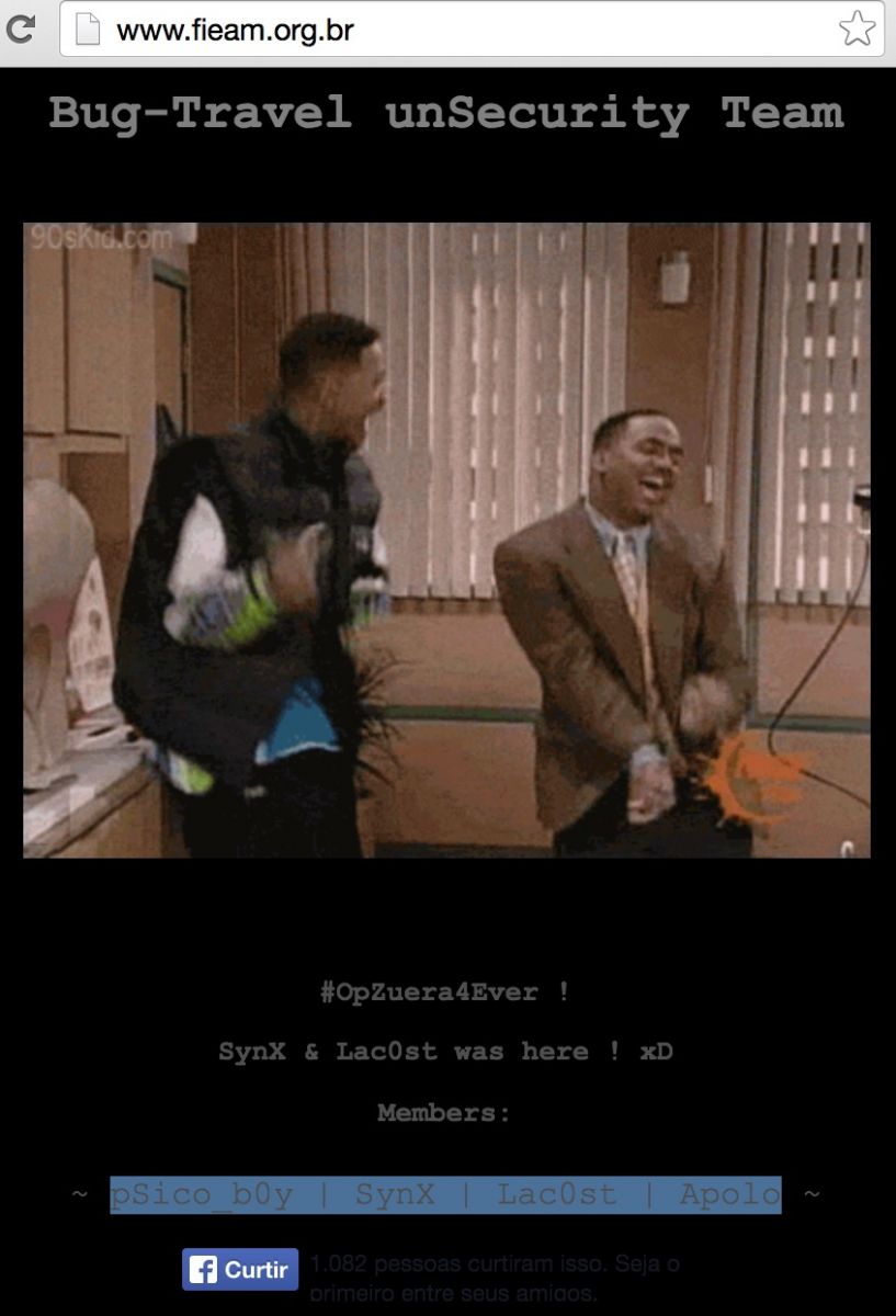 Na página inicial da instituição um gif mostrava Will Smith e Afonso Ribeiro dançando em um trecho do seriado "Um maluco no pedaço", seguido da hashtag #Zoeira4ever (Zoeira pra sempre) e da frase em inglês "SynX & Lac0st was here" (SynX & Lac0st estiveram aqui). Como fundo musical, os autores da invasão programaram a execução da música "Pepeca malcriada", um funk de autoria do MC Dudu.