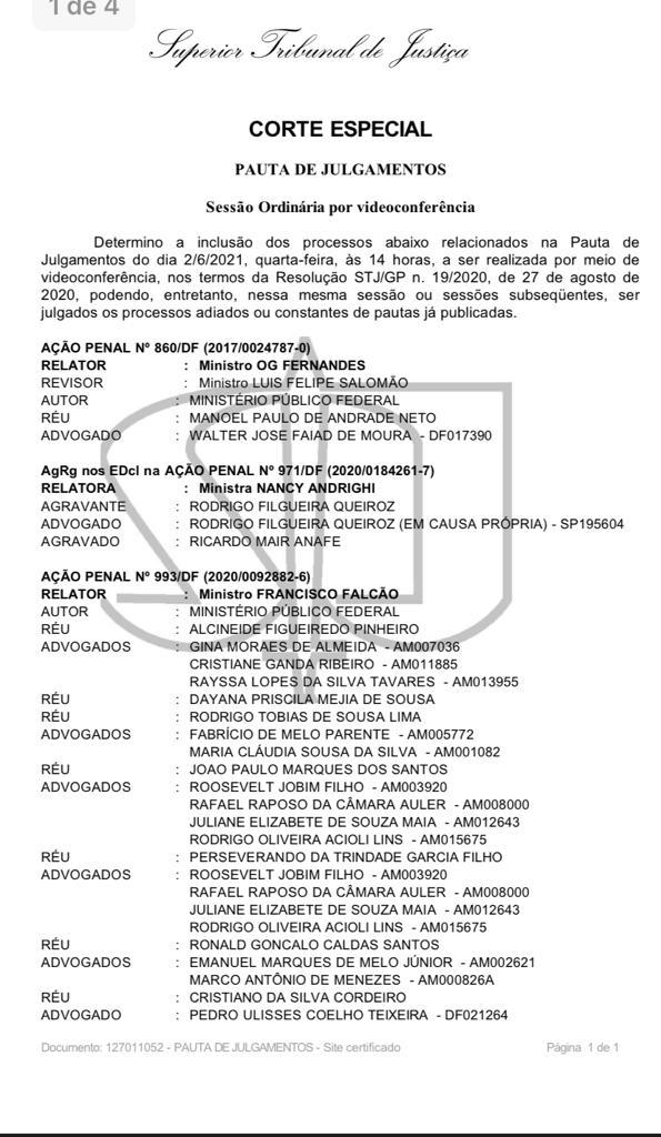 A denúncia foi oferecida pelo Ministério Público Federal (MPF) contra o governador do Amazonas, Wilson Lima (PSC), o vice-governador Carlos Alberto Almeida Filho e mais 16 pessoas, na Pauta de Julgamentos do dia 2/6/2021.