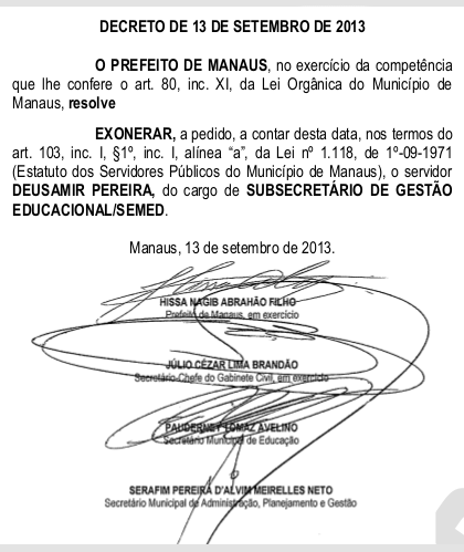 O subsecretário municipal de Educação do Município de Manaus, Deusamir Pereira, deixou o cargo na sexta-feira após pedir exoneração ao prefeito Artur Neto. Deusamir alega que vai cuidar da vida Pessoal, se dedicar ao magistério e à família. O professor alegou cansaço. O ato de exoneração do subsecretário foi publicado no Diário Oficial do Município que circulou dia 13.