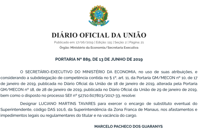 Na edição do Diário Oficial da União (DOU) desta segunda-feira, dia 17 de junho, foi publicada a portaria nº 889, do Ministério da Economia, datada do dia 13, designando como substituto eventual de Alfredo Menezes, em seus impedimentos ou vacância do cargo, o adjunto de Operações, Luciano Martins Tavares.